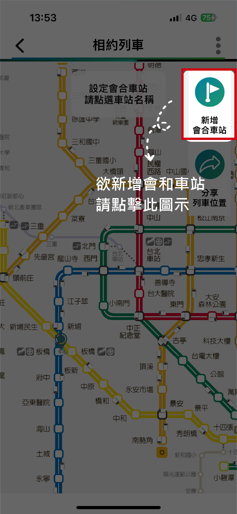 如欲新增會合車站,點擊右上角「新增會合車站」(紅框處),再依提示點選車站名稱,並輸入備註(如「五號出口等你」)。
