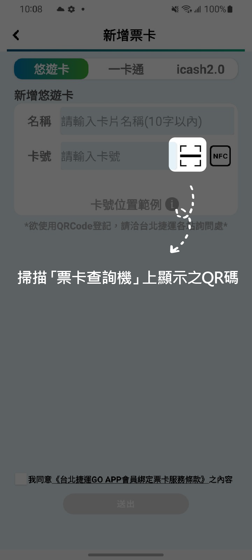選擇票卡類別後輸入票卡名稱並掃描「票卡查詢機」上顯示之QR碼