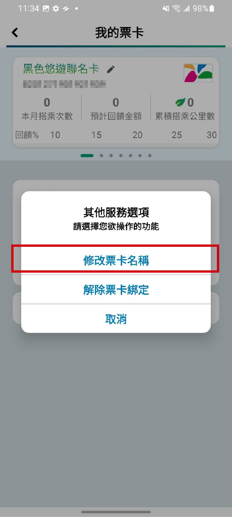 輸入新的票卡名稱後按下送出,即跳出彈跳視窗點選確認,完成修改票卡名稱